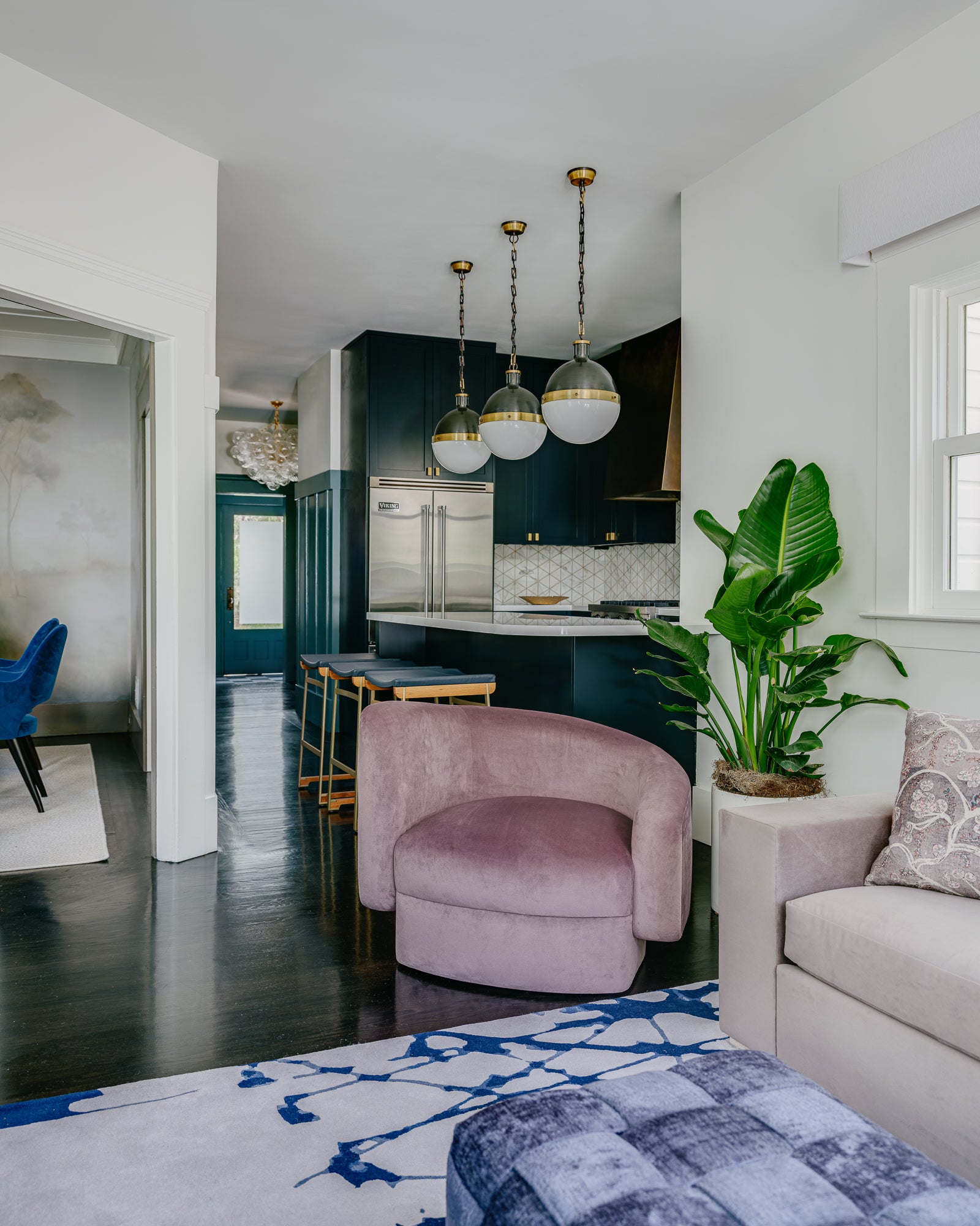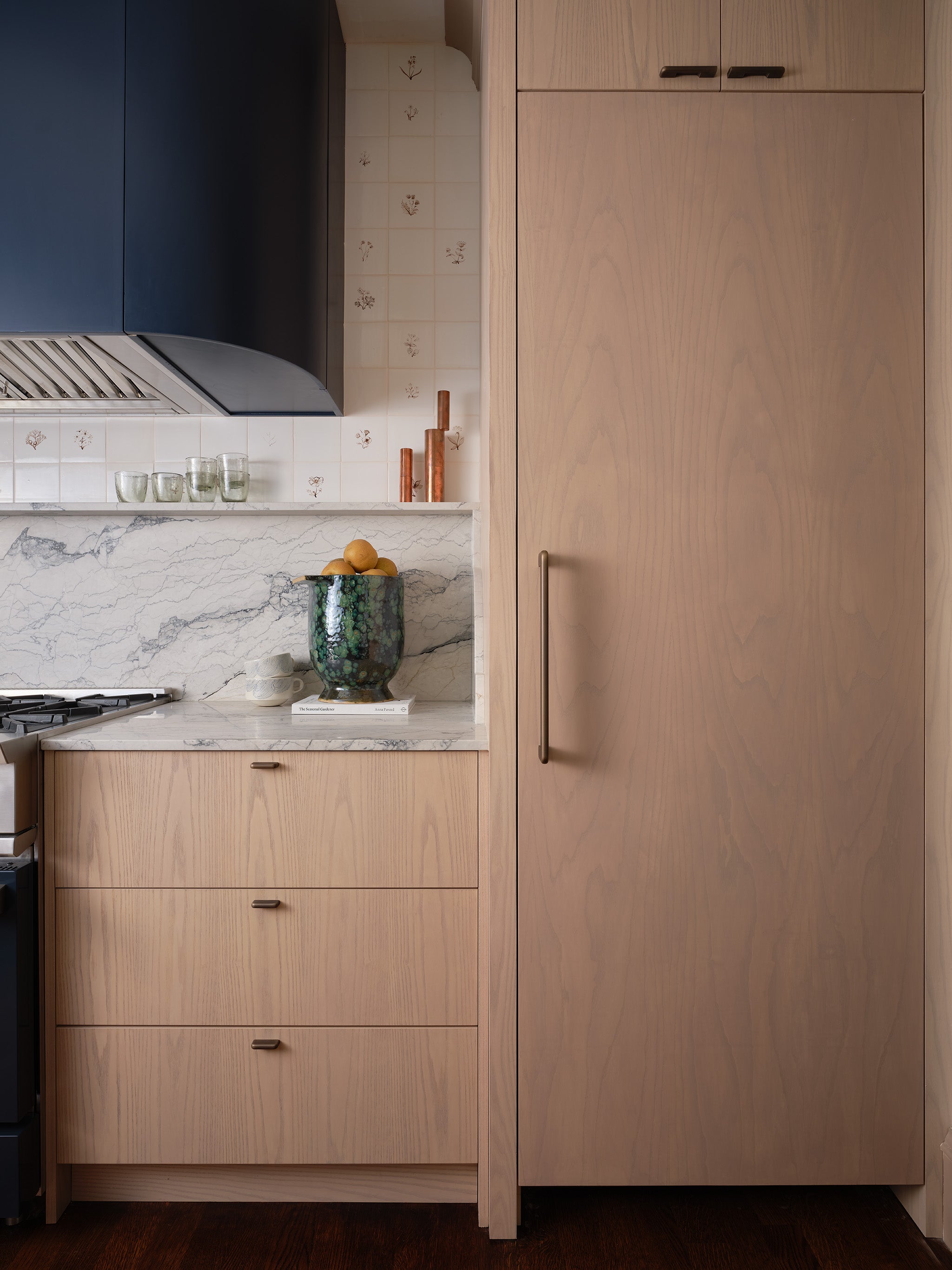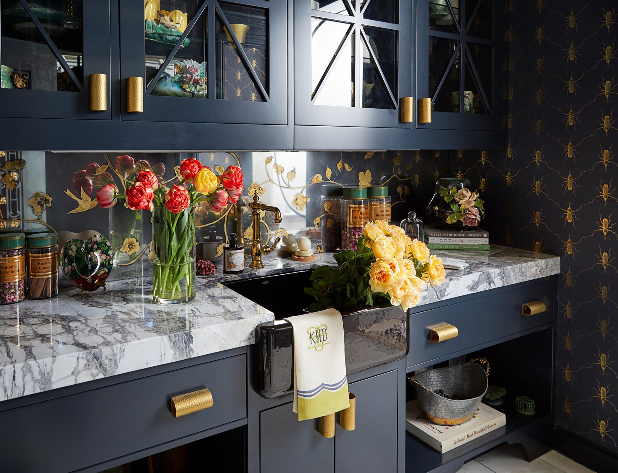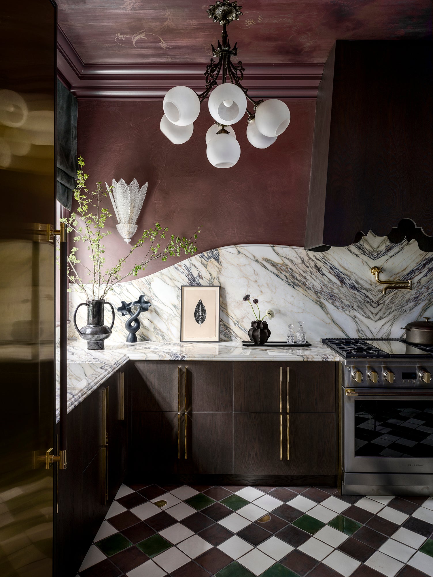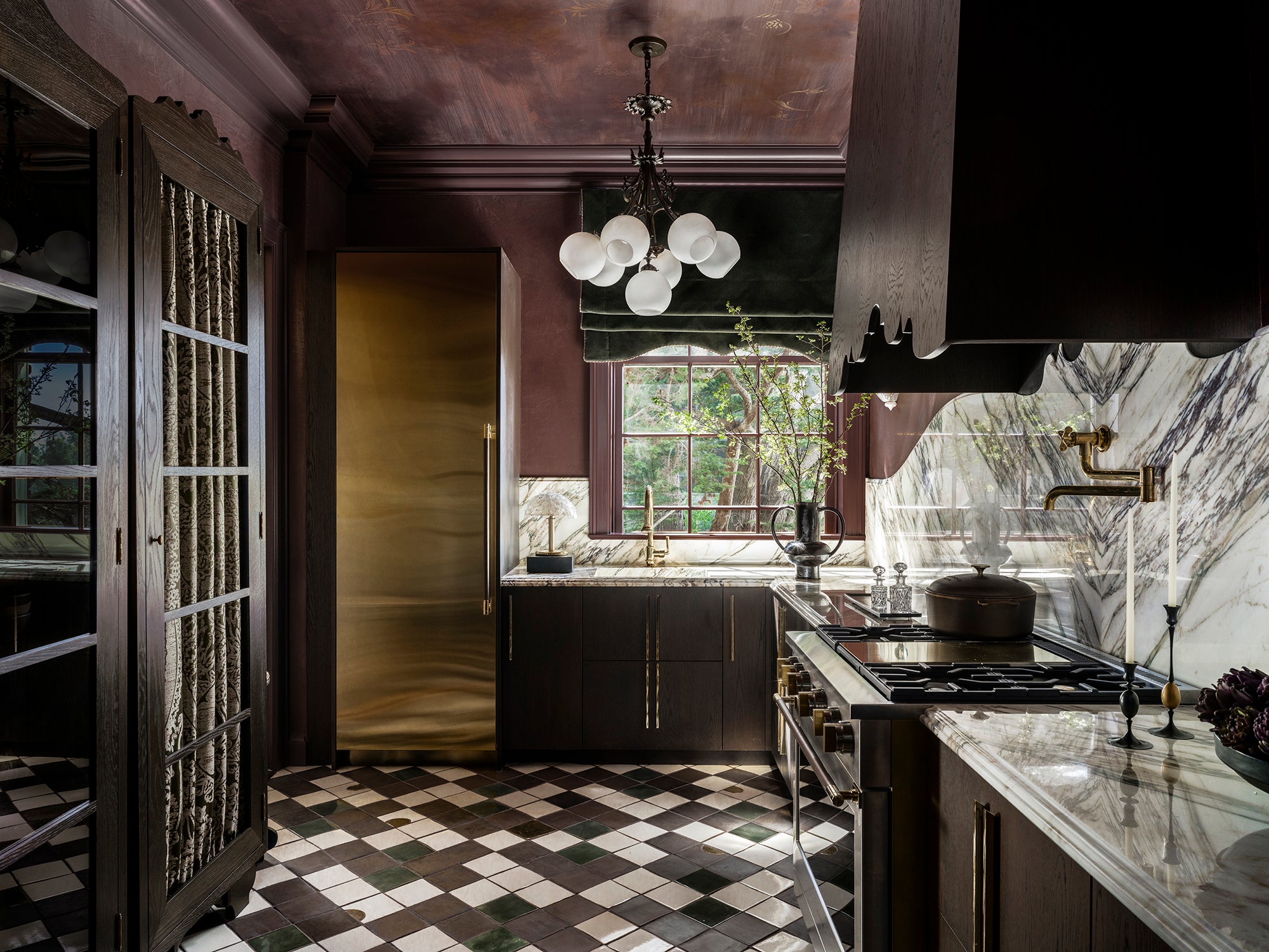 Sensual, moody, and packed with thoughtful details, K Interiors Jewel Box Kitchen for the 2024 SF Decorator Showcase took inspiration from both Victorian and Art Deco influences. Principal Kristen Peña installed book matched sets of our polished brass Block and Half Inverse Flat Trapezoids on each cabinet drawer for a refreshing twist. Photos by Christopher Stark.