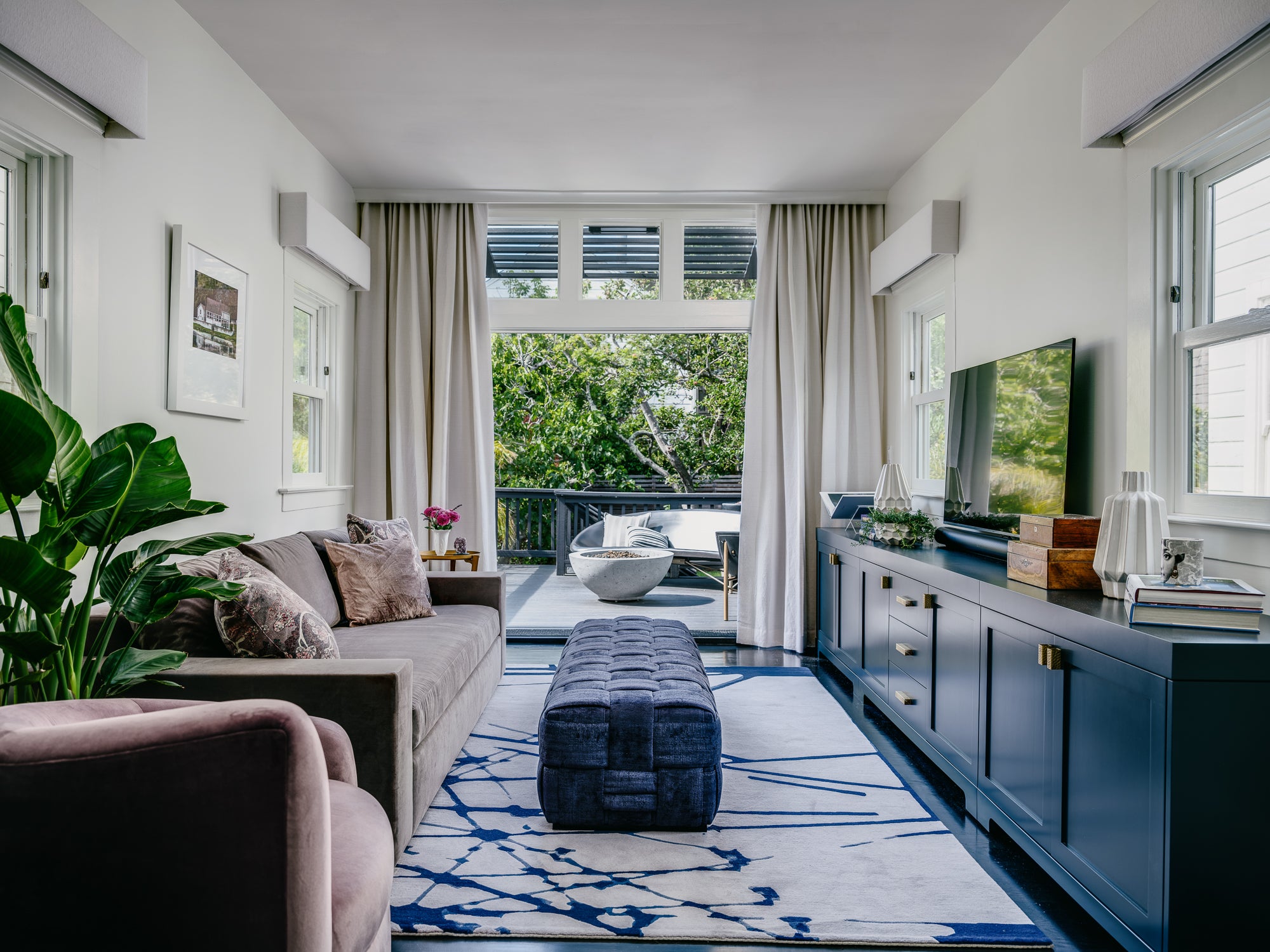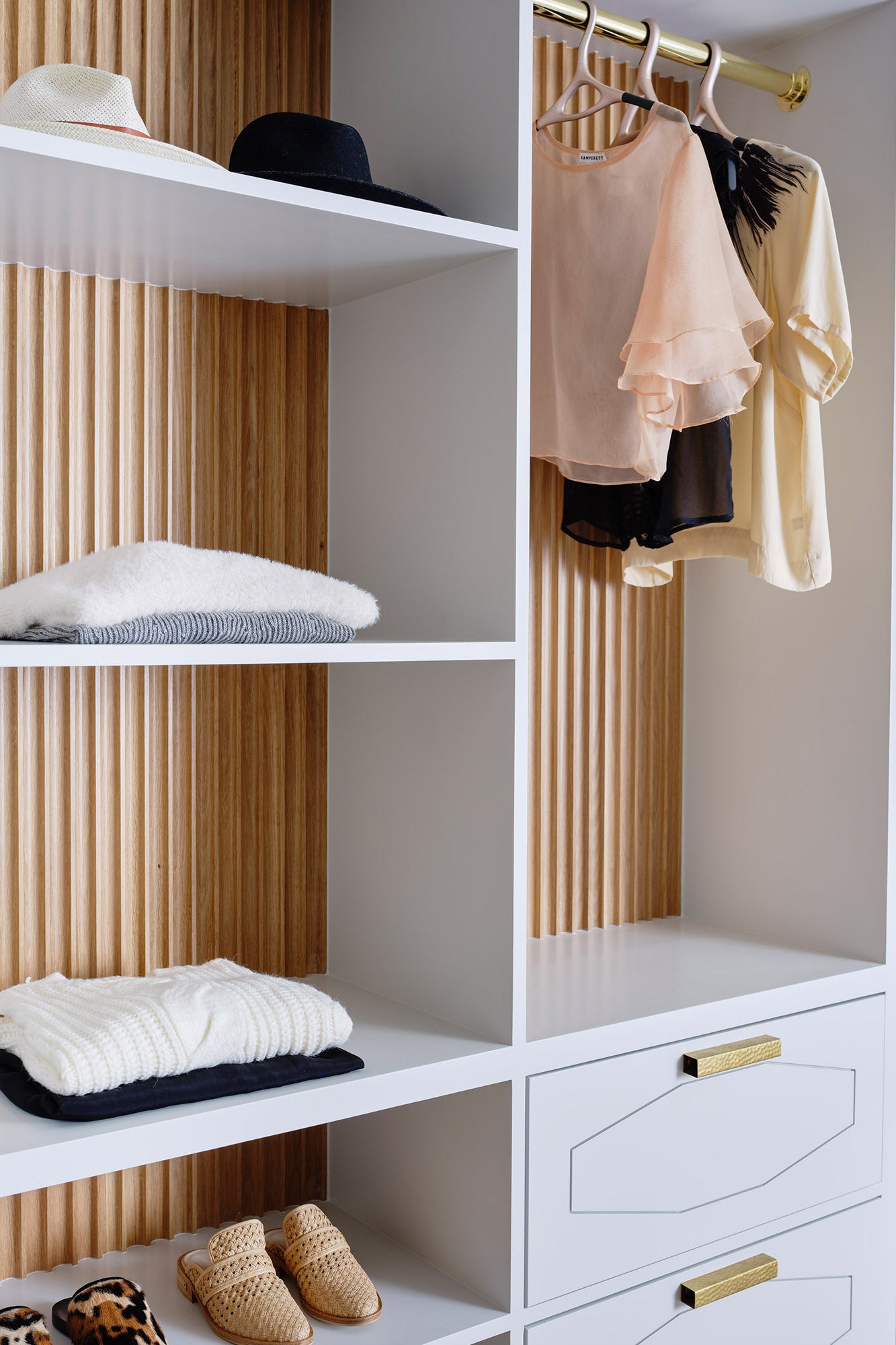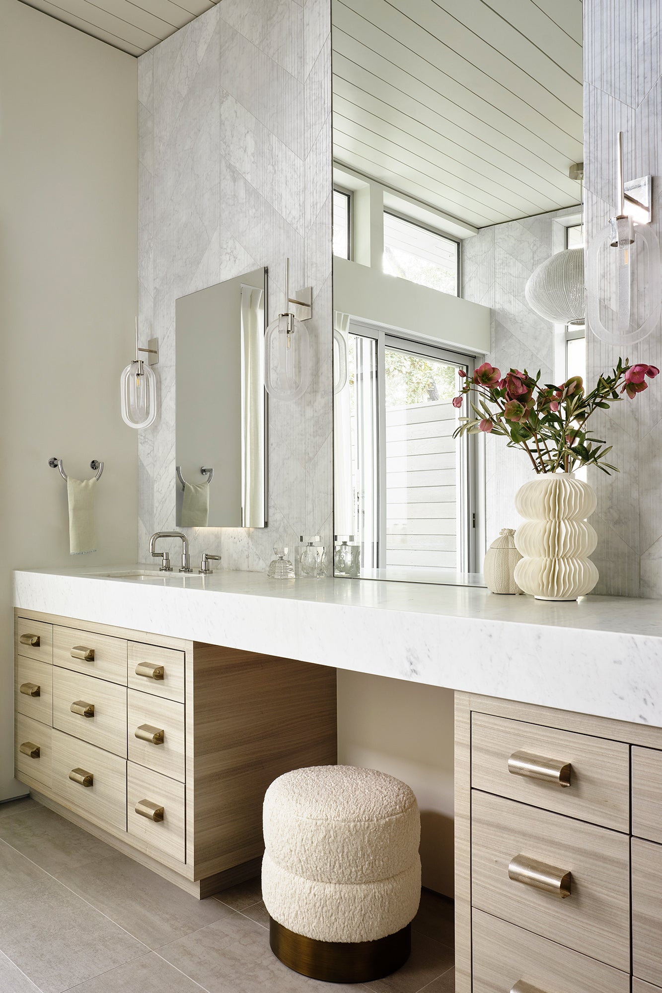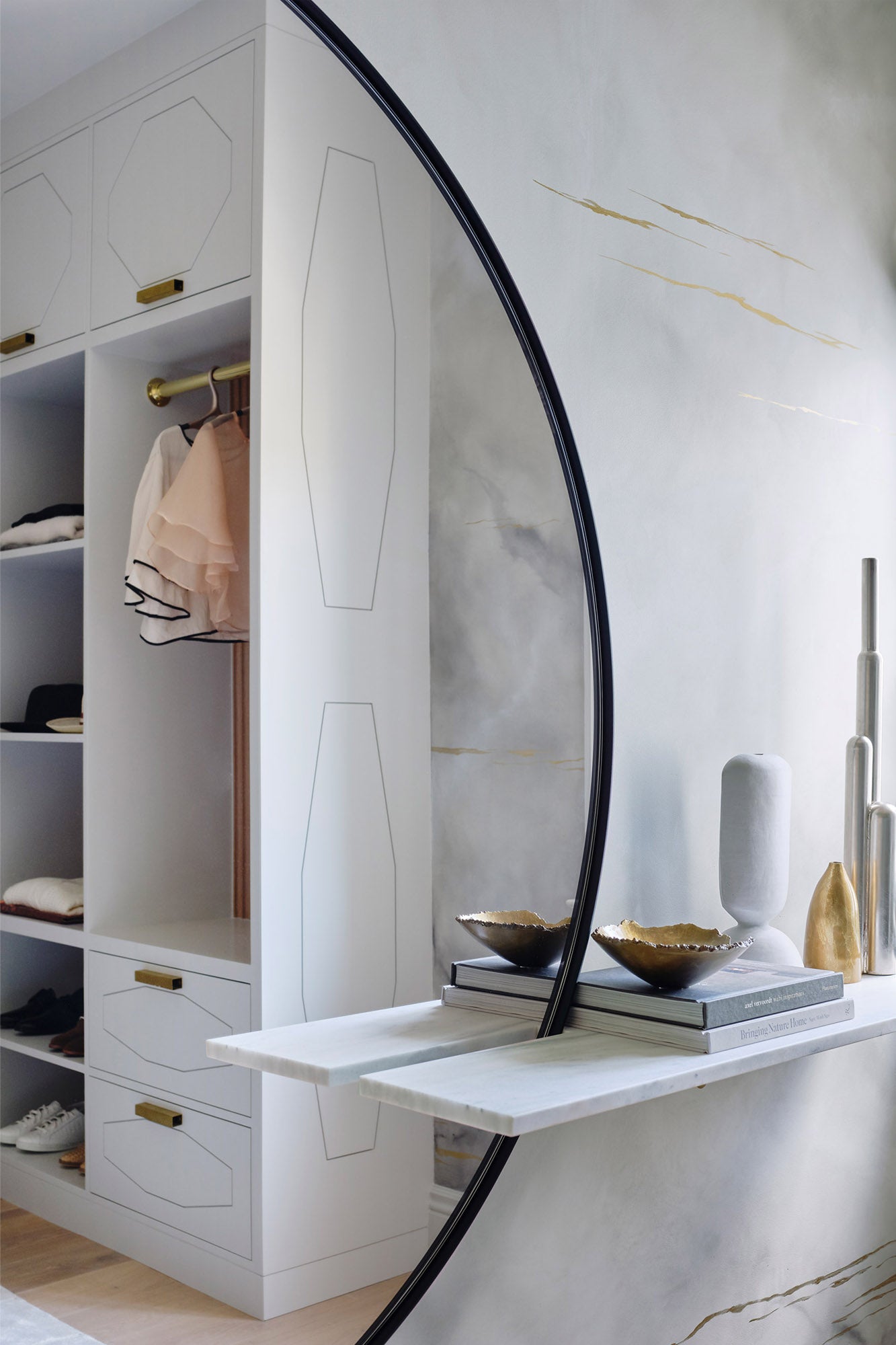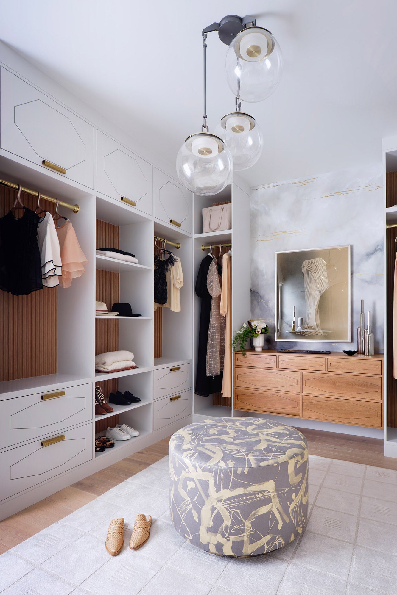 For the Primary Suite in the 2020 San Francisco Showcase, Principal Designer Kristin Pena drew inspiration from natural elements to create a space that looks and feels like a contemporary sanctuary. The Hoffman Hardware hammered brass rectangles, stunning lighting, and custom window treatments set the tone of luxury immediately upon entering the dressing room space. Photo by Brad Knipstein.