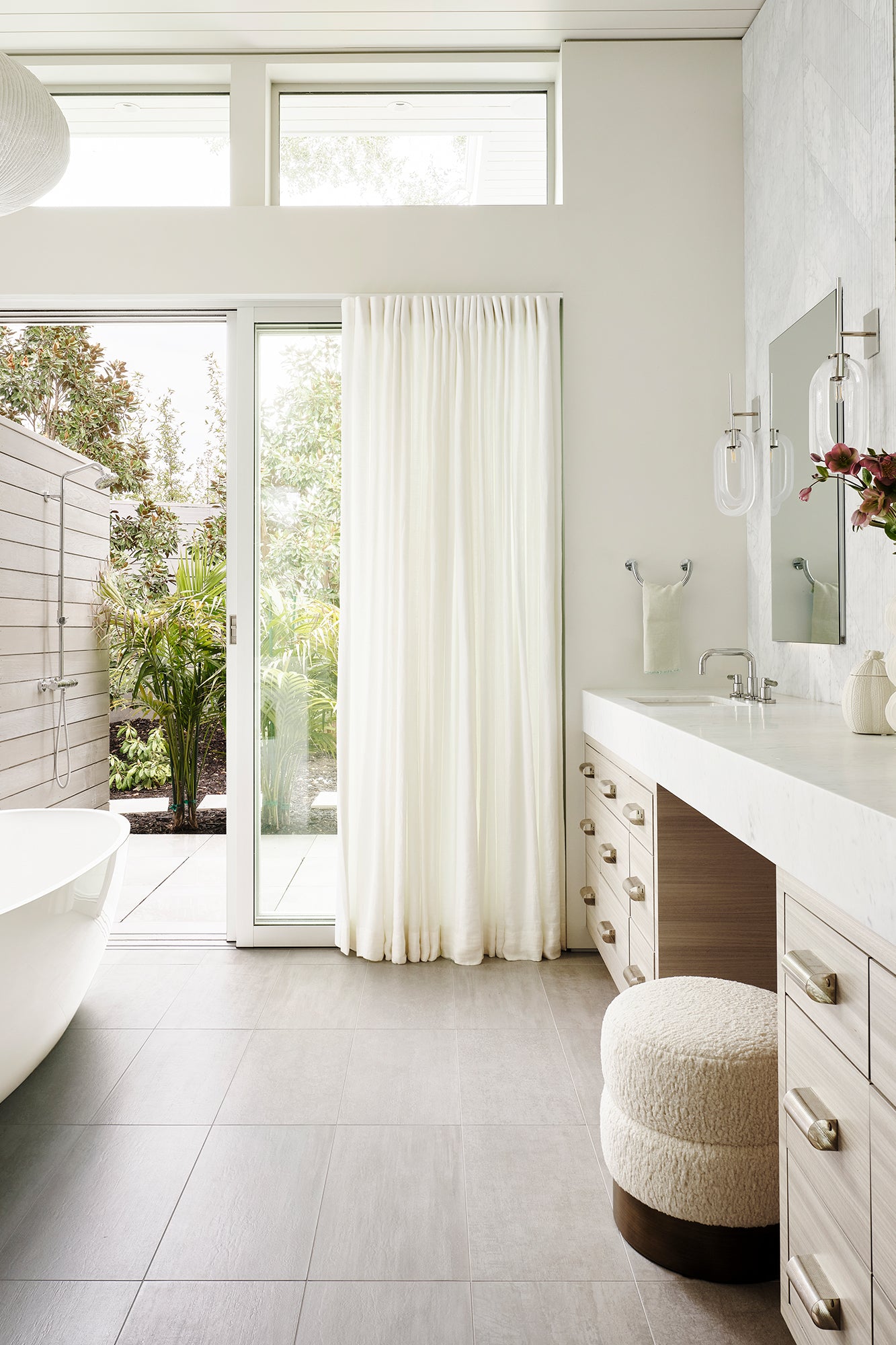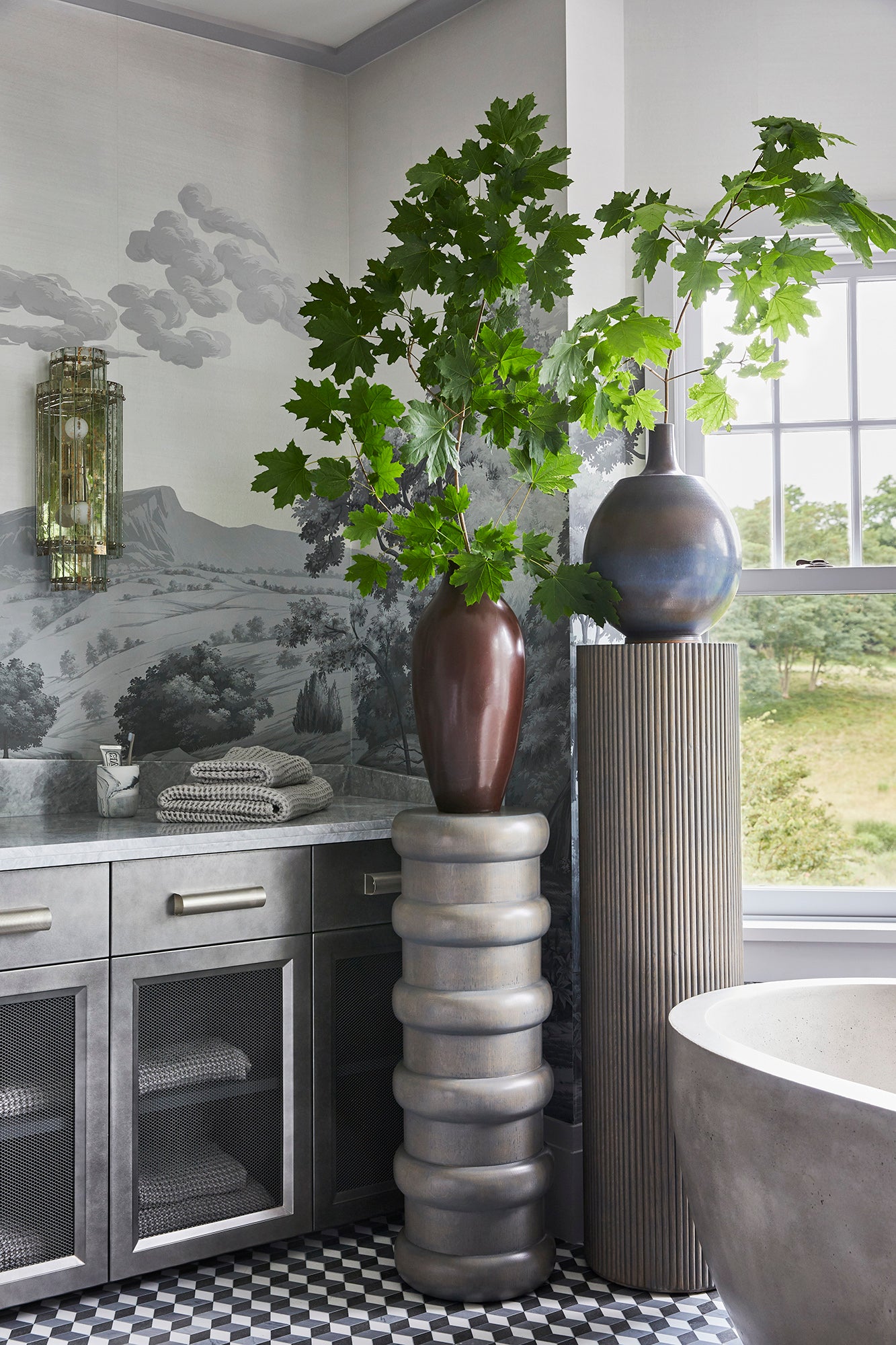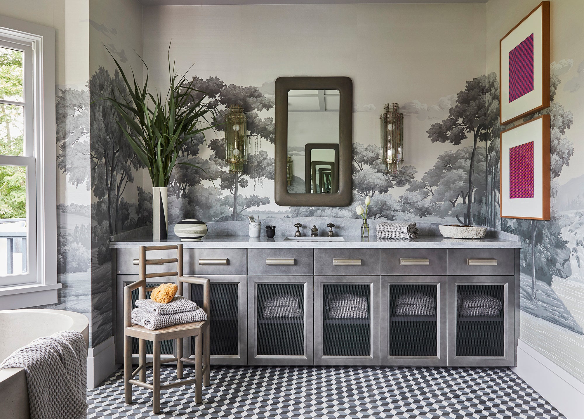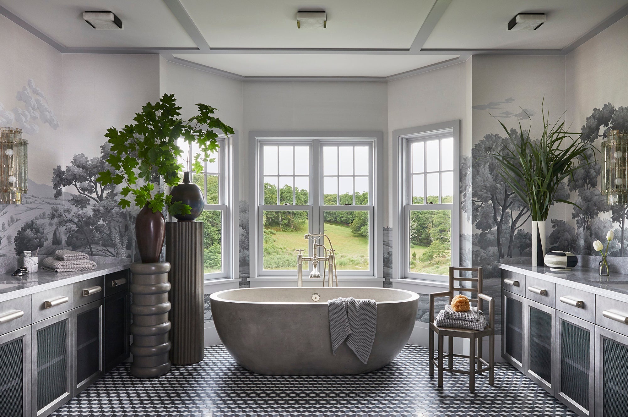 Elegant layers of gray inspired by an overcast day at the beach was the design directive for this primary bath suite at the Galerie House of Art and Design Showhouse in Sag Harbor, New York. AD100 Designer Josh Greene selected Hoffman Hardware's perforated cuffs in satin nickel as the finishing touch for the moody custom cabinetry.