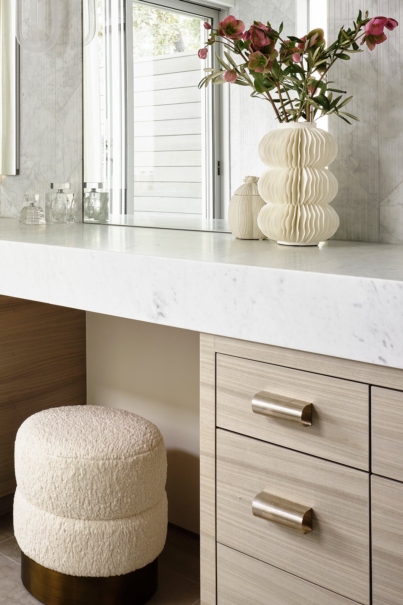 Award-winning designer Tineke Triggs is known for creating soulful, artistic and imaginative interiors. In this Hillsborough, California bathroom, Triggs uses organic materials and textures, paired with Hoffman Hardware's satin nickel cuffs, to create a space that is luxurious, livable and distinctly unique. Photography by Brad Knipstein.
