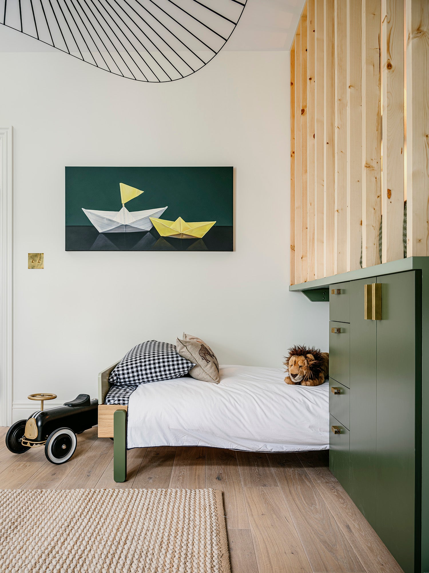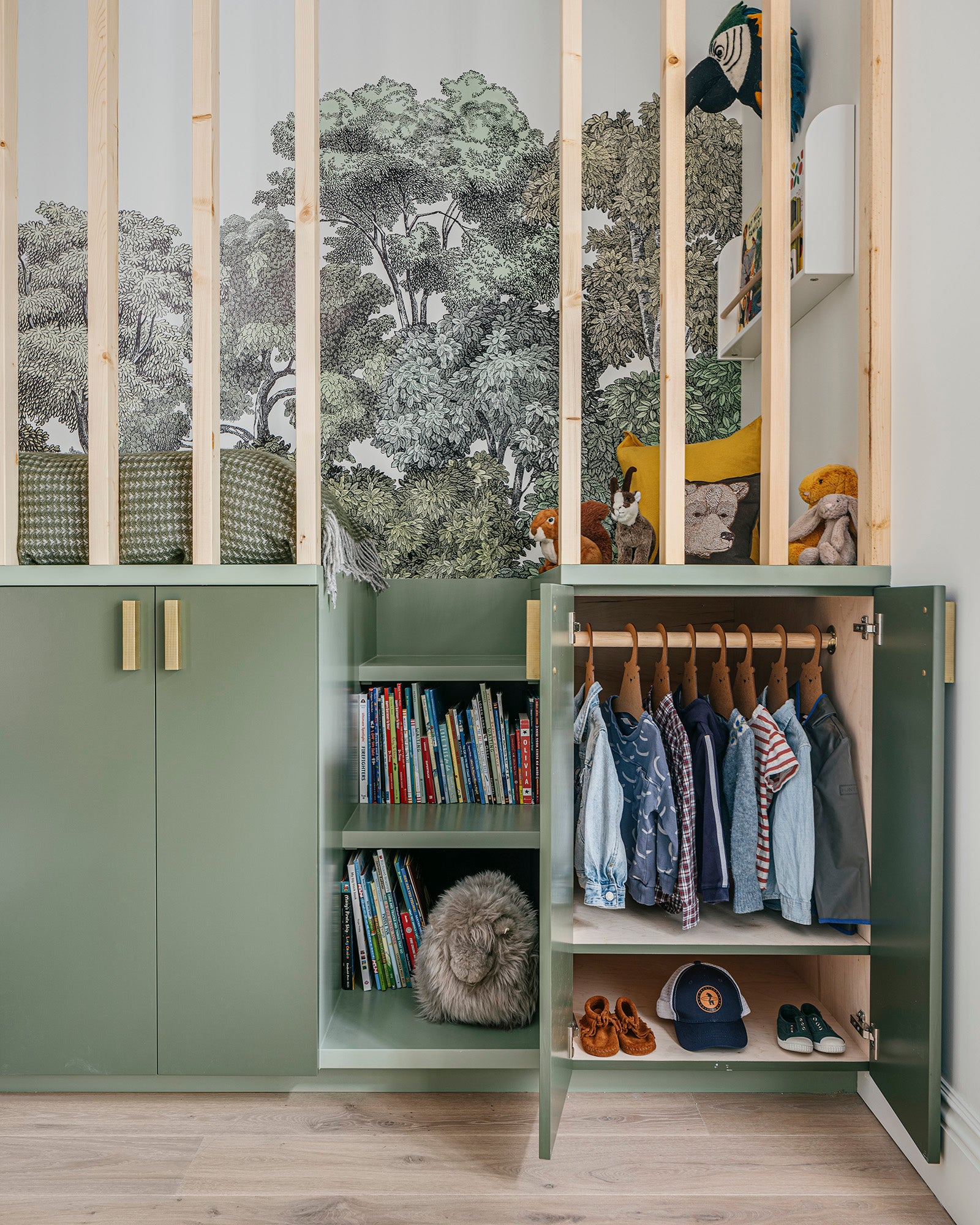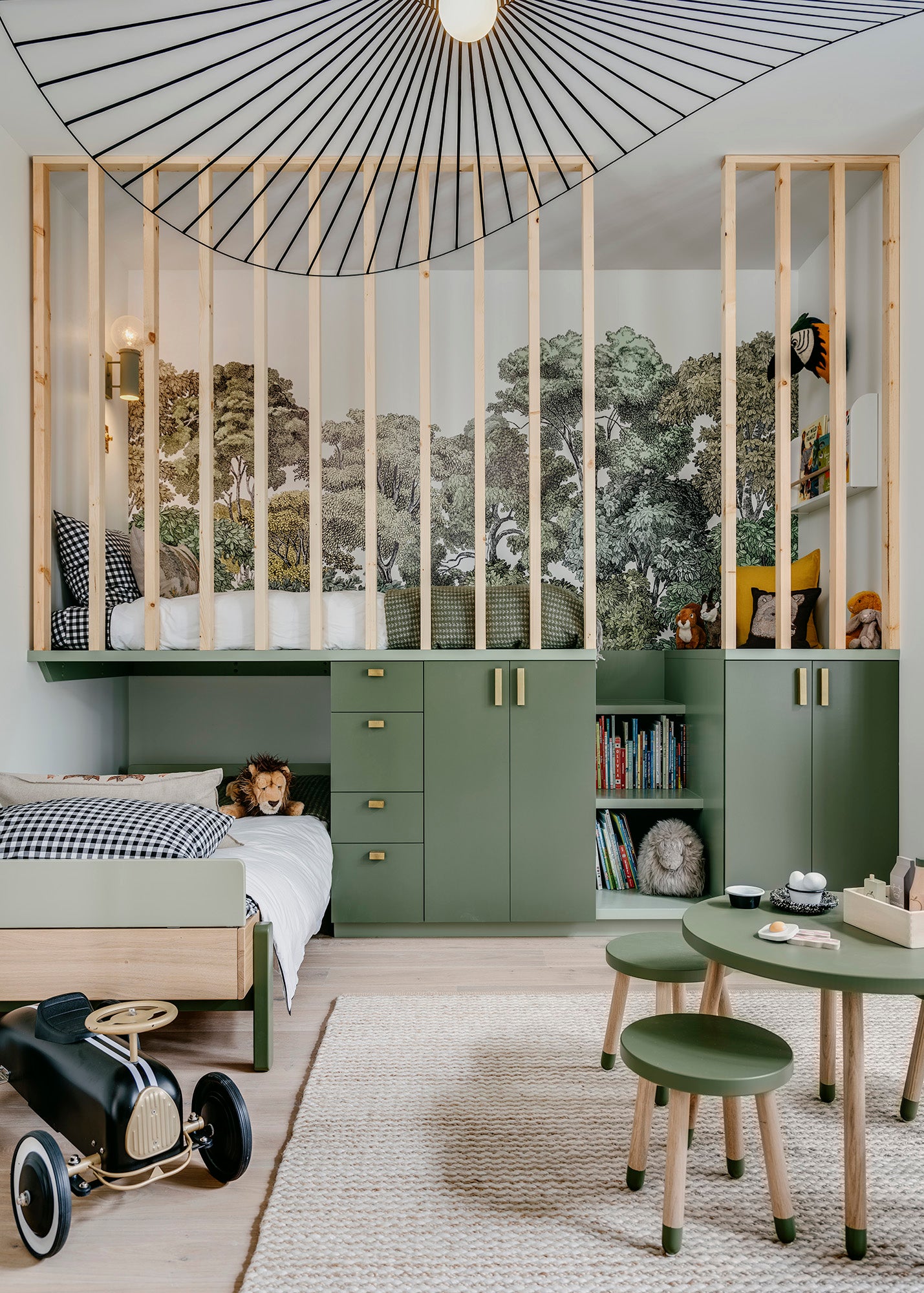 Benni Amladi featured Hoffman Hardware's perforated rectangles and squares in her Lumber Slumber children's bedroom for the 2020 SF Decorator Showcase. Taking cues from childhood tree forts, the unlacquered brass pulls are both expressive and modern in this material forward designed space. Benni's boutique design studio is now based in Miami, FL. Photography by Christopher Stark.