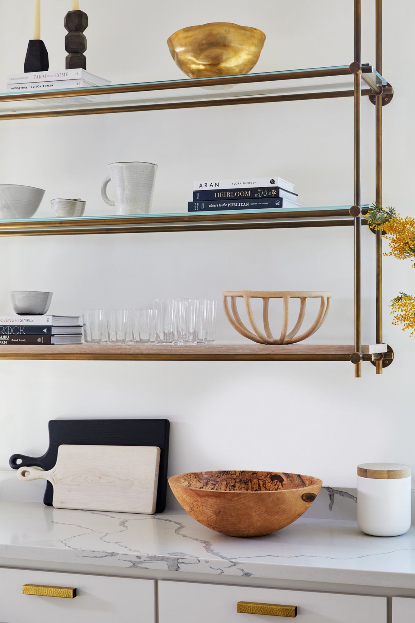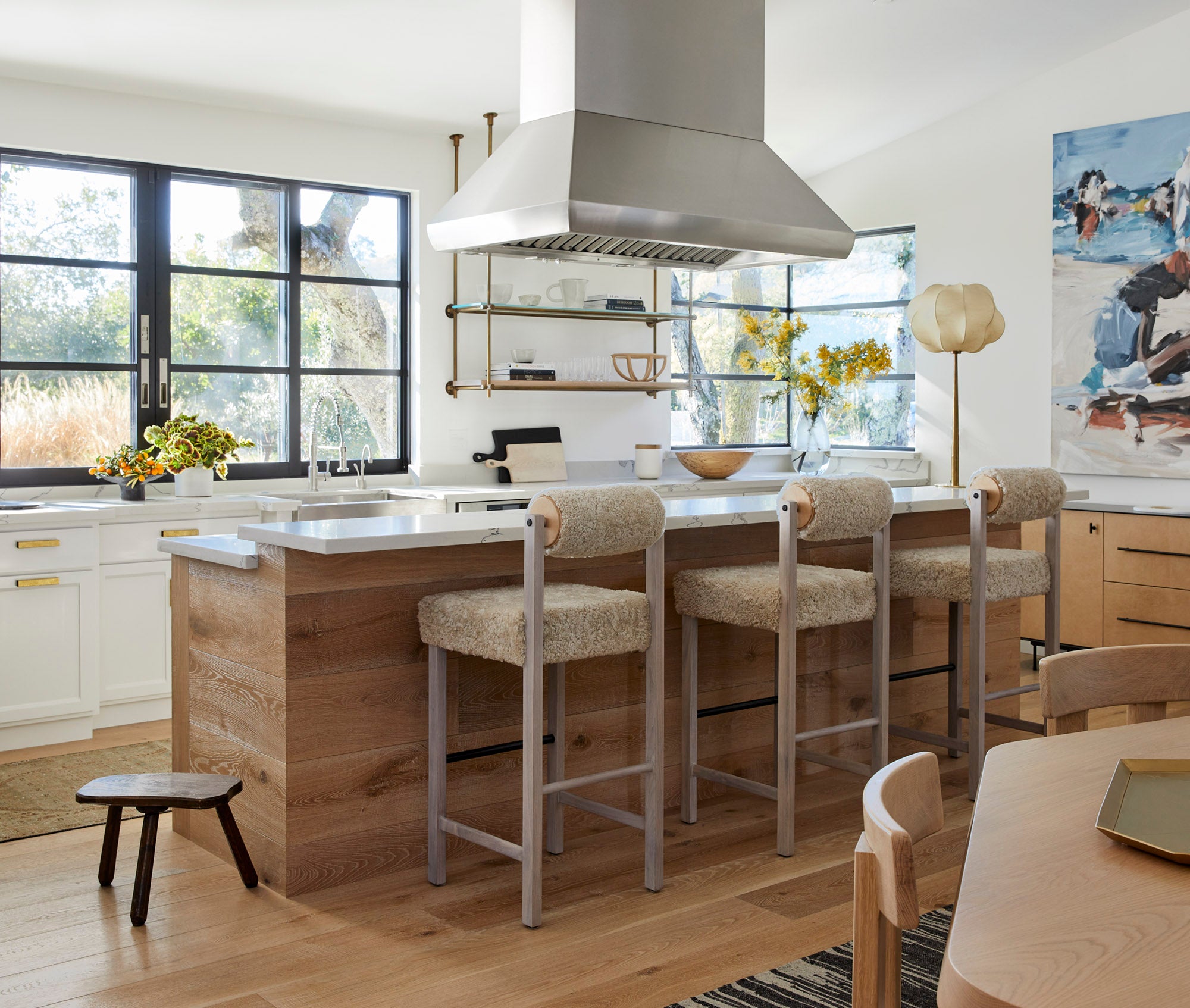 Sensual, supportive, and thoughtfully curated, K Interiors spaces are as livable as they are compelling. Principal Designer Kristin Pena selected unlacquered brass Hoffman Hardware for this Napa Kitchen and paired it with new pieces and vintage finds, natural materials and sleek surfaces, resulting in a kitchen that feels effortless, timeless, and chic. Photography by John Merkl.