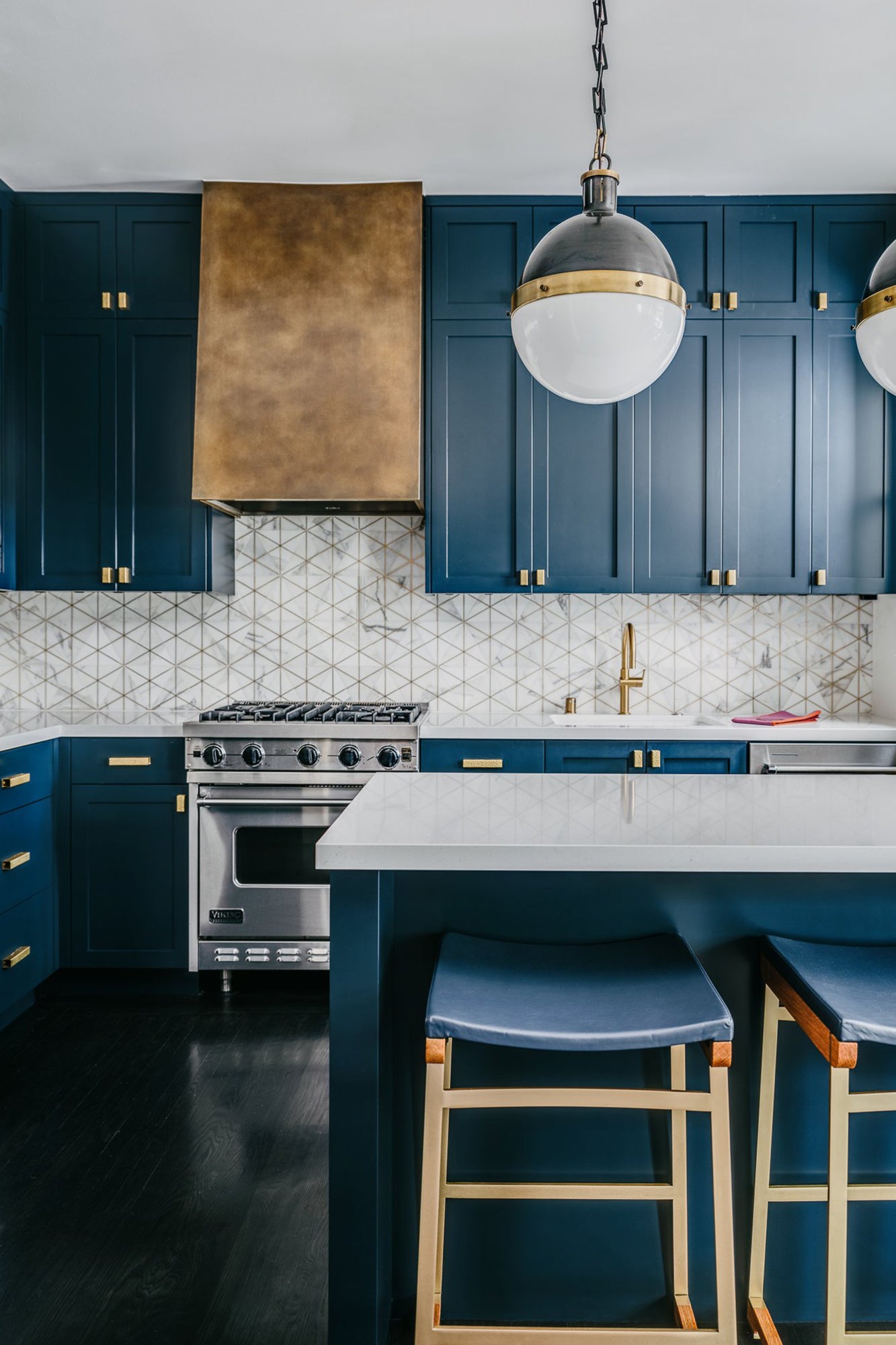 San Francisco Designer Kari McIntosh, known for her warmth and resourcefulness, delights in storytelling through interiors. She selected Hoffman Hardware's bespoke hammered cuffs for this kitchen's glamorous facelift with dark cabinetry, brass inlay marble backsplash, and a custom brass hood. Photography by Christopher Stark.