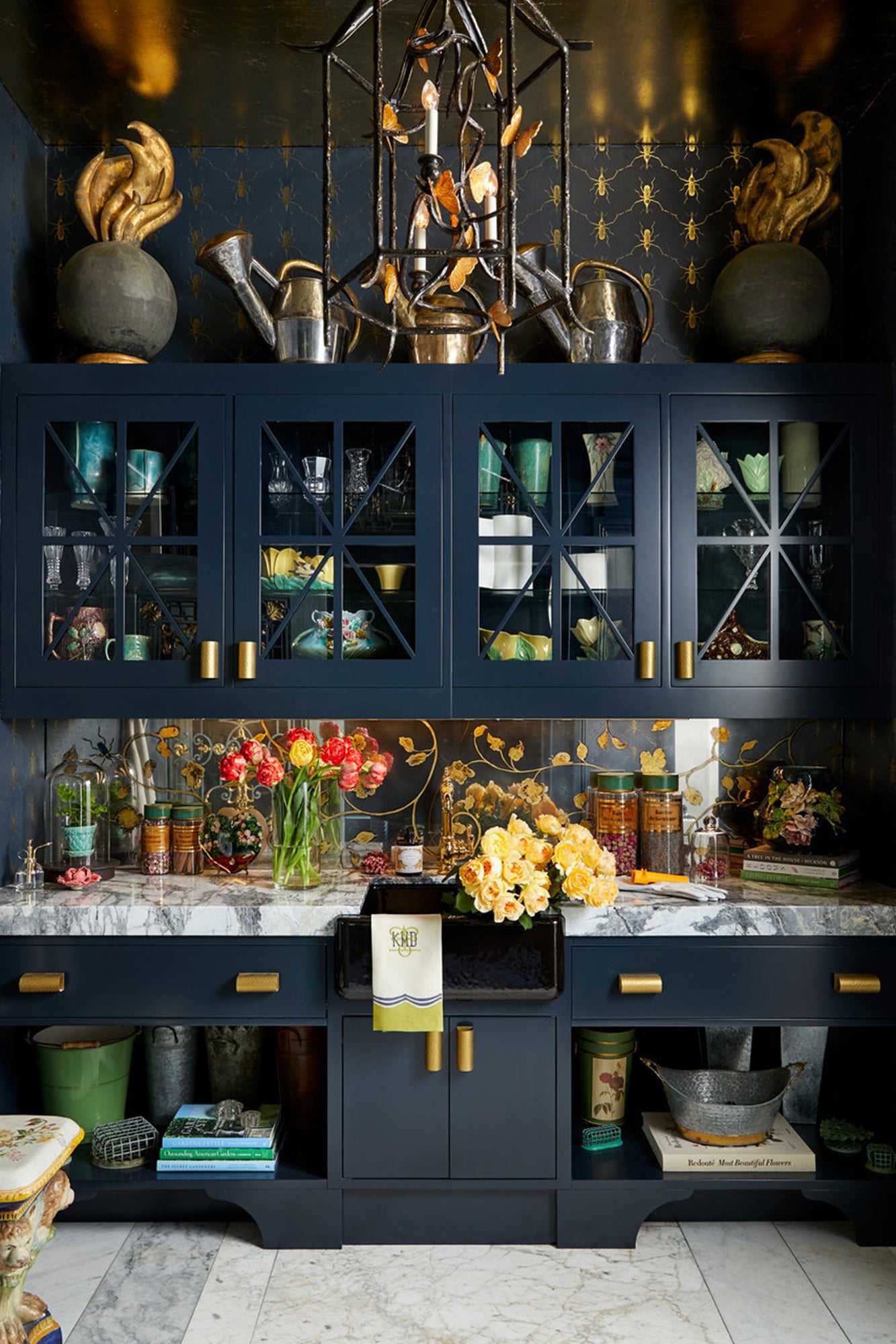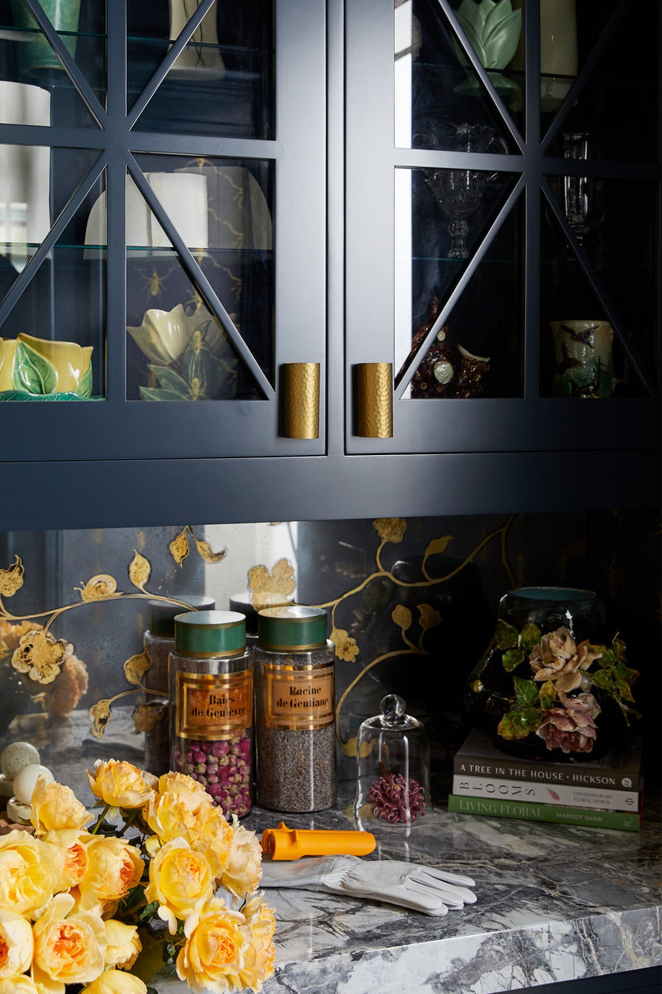 Kari McIntosh Design featured Hoffman Hardware in her 2019 San Francisco Decorator's Showcase jewel-box. Her elegantly designed floral room's black apron sink, custom faucet, gilded wallpaper, gold-leaf ceiling, and brass Hoffman Hardware bring the drama to this stunning space. Photography by John Merkl.